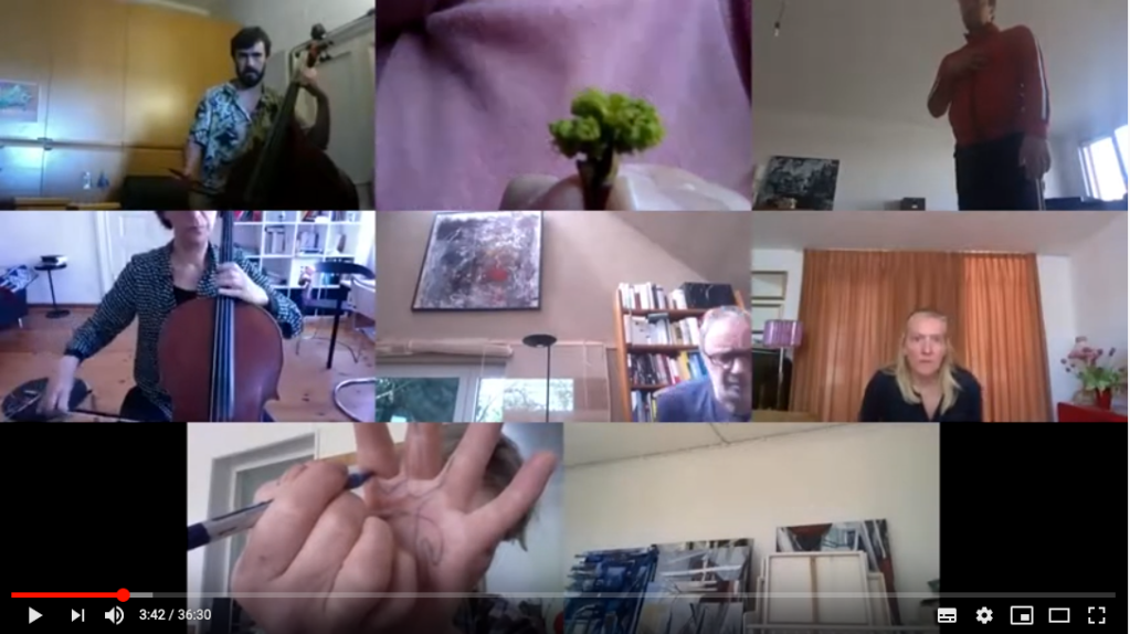 How to improvise via technological tools like tele-conferencing? What are the limitations, what are the joys of these modes of live gatherings, extending into the living spaces of so many people at once, making all those places performance spaces to be used!