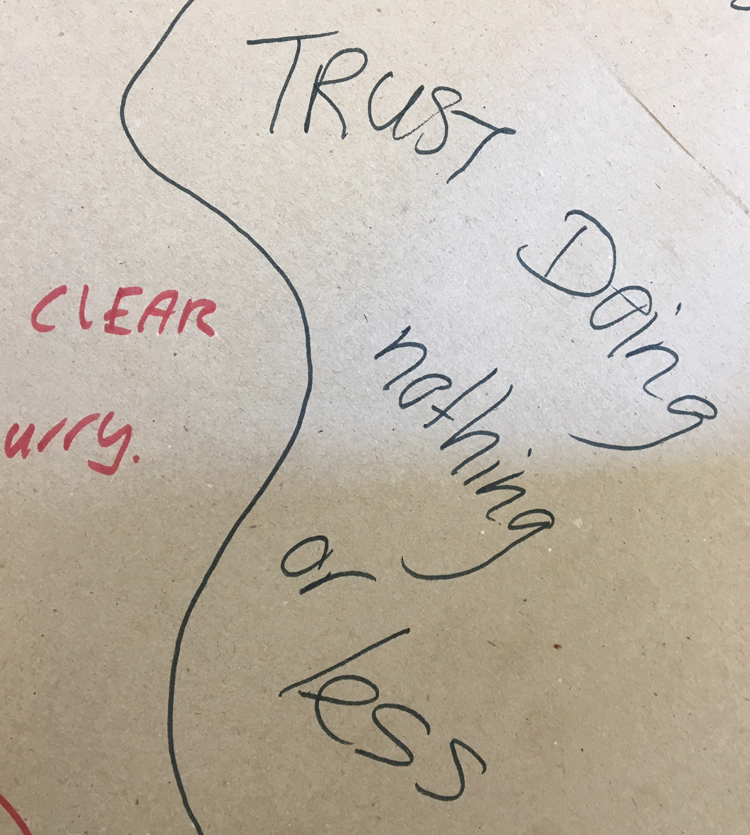 As we improvisationally organized our improvisational festival, we added a threshold of simplicity of 10 minutes between each block of activity. It was a reminder to trust the simplicity, trust the doing of little, the small repetitions, not producing, not getting louder or more active.